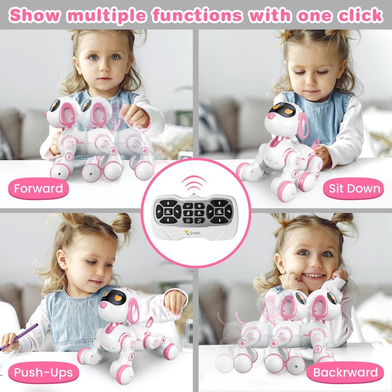 - đ€ăProgrammable Robot ToyăThe robot dog features easy programmable functions that allow kids age 3 years and above to customize this robot dog's actions and behaviors. You can imports a series of actions that the robot toy performs by the remote controller, then the intelligent robot dog will record and execute the commands. It's both a fun and educational robot toy for kids that promotes creativity, and problem-solving skills.
