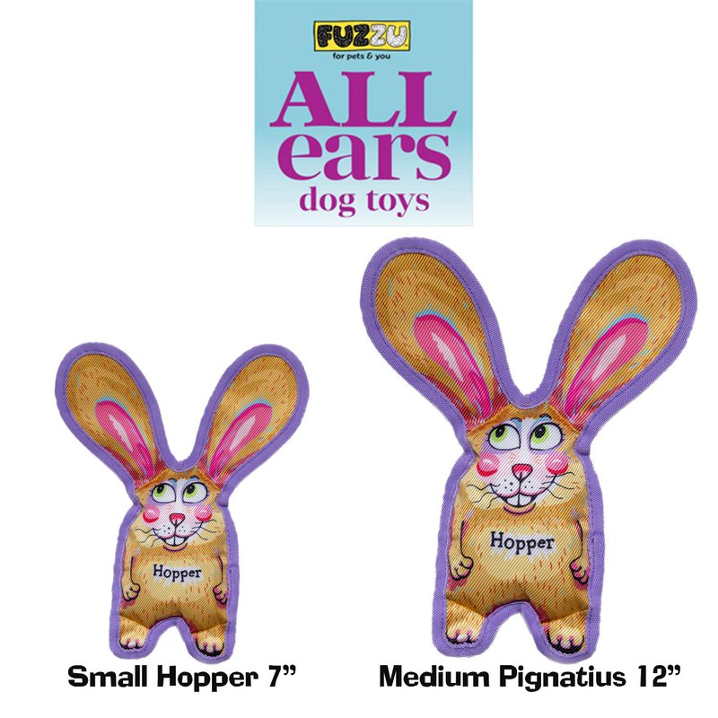 Chew or tug! Whether in the mouth or under a paw, this bunny will want to play! FUZZU’s Hopper Dog Toy is loaded with a robust squeaker and tons of crackly-crunch to provide your pup with hours of rollicking fun! Hopper is excited and ready to play and is fully equipped with long flappy ears for your pup’s entertainment. This toy is durable! Hopper is made with rough ‘n’ tough polyester twill and bound by strapping-strong trim for extra durability. This design ensures long-lasting play value, even with aggressive and vigorous chewers. This comic pet toy will give hours of fun, enjoyment, and laughter to both owners and pets alike. Our All Ears dog toy is a real attention-grabber wherever you and your dog take him (the park, in the car, or at the office.)