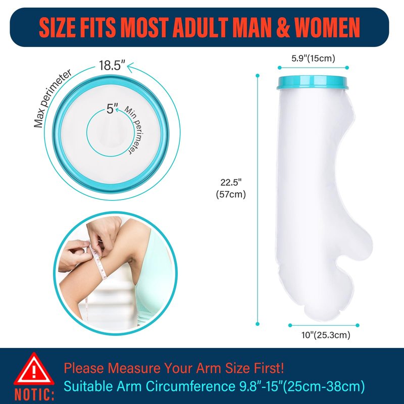 - ⌛FITS MOST ADULTS --This waterproof cast cover is 22.5 inches long and fits most men and women's lower arms and hands. The center hole fits arms diameter from 2"to 7.3", for upper arm circumference between 9.8" to 15" (25cm to 38cm)—flexible and comfortable design with extra space for more movement.
