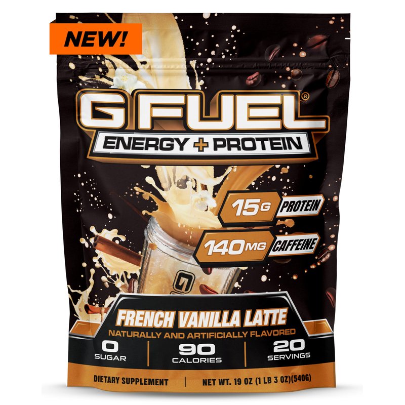 G Fuel Protein + Energy Drink Powder, Pre Workout Caffeine Powder, Energy Powder Drink Mix for Gaming, Sugar Free Focus Amino, Vitamin + Antioxidants, 19oz (French Vanilla Latte, 20 Servings)