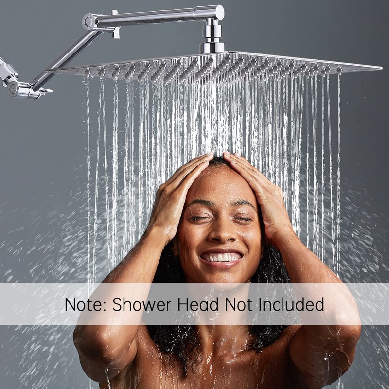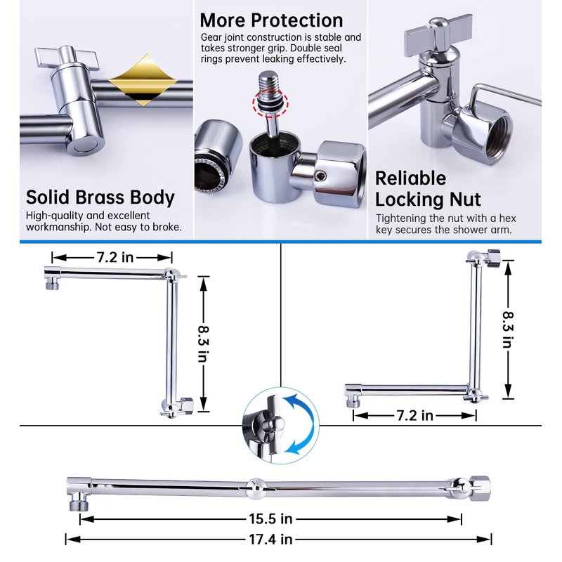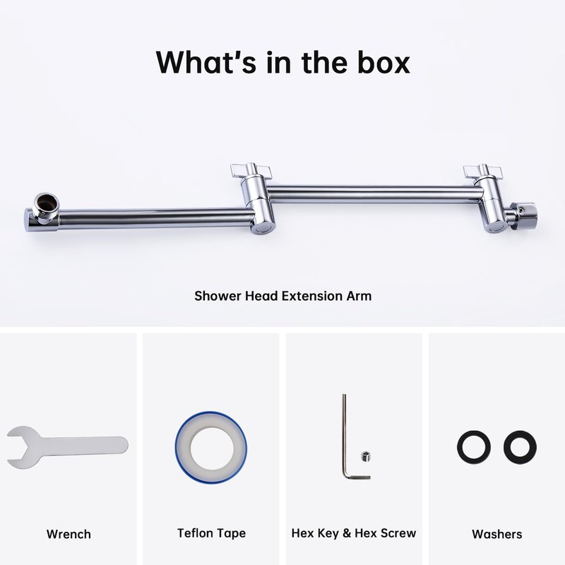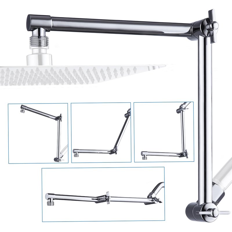- ►16 INCH SHOWER EXTENSION ARM: Keeps the shower head away from the wall. You can adjust the height, distance and angle with two knobs to meet your specific needs. The free spinning locking collar allows you to tighten the extender in a correct position.