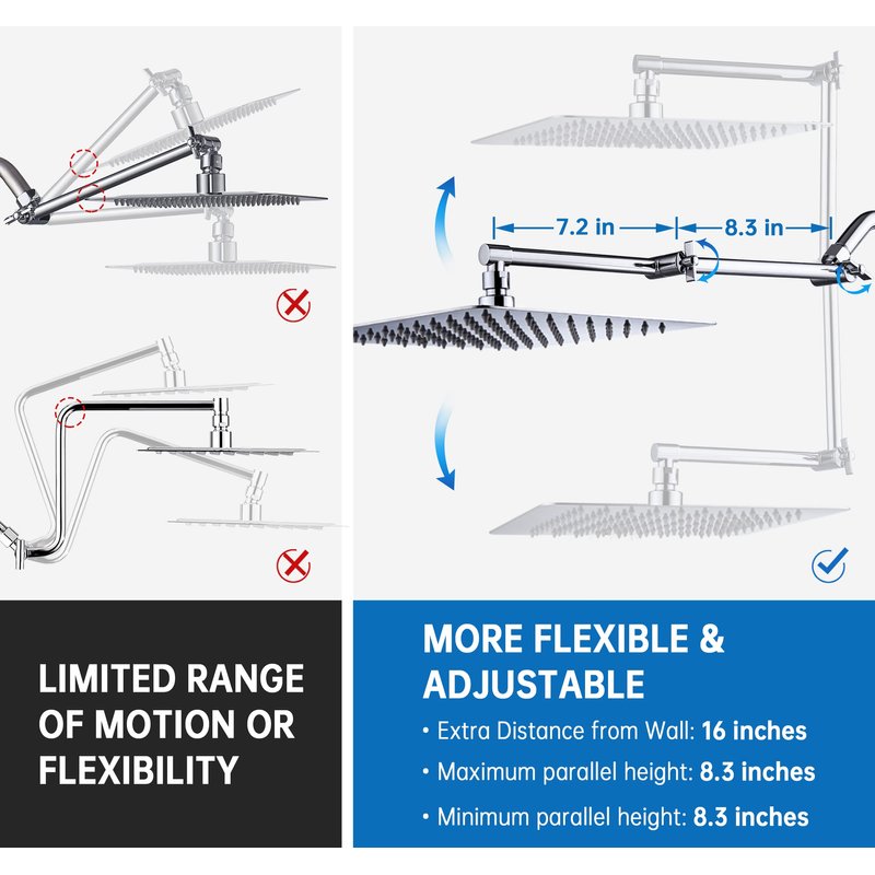 - ►PATENT DESIGN, MORE FLEXIBLE & ADJUSTABLE:You can use it as a gooseneck extension to raise your shower head by 8 inch. You can also use it as a regular extender to keep the shower head extra 16 inches away from the wall. You can even lower the shower head by 8 inches. Compared with the regular extender, this one can raise the shower head higher or lower and keep the shower head in a horizontal position all the way.