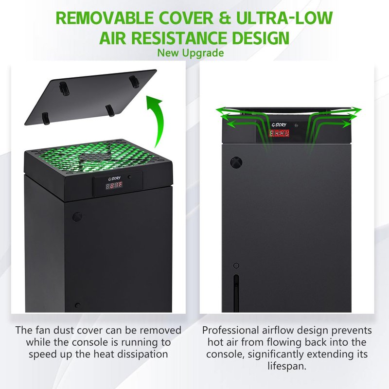 - 🍃Intelligent Control & Custom fan speed-[Automatic Mode]: The chip of G-STORY Xbox Series X cooling fan can automatically sense the temperature to adjust the fan speed, you can just enjoy the game and leave the heat to our cooling fan. (when the temperature is <35℃/95℉, it will stop working.) [Manual Mode]:Press the button to select the 3 speed you need, the LED will change color with the speed. (Note: Press down the button for 3s to switch between manual and automatic mode.)