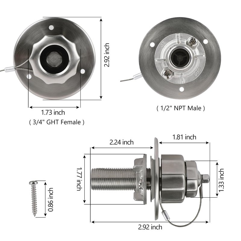 - RV inlet specifications: 3/4" GHT internal thread pipe outside the rv water inlet, 1/2" NPT external thread pipe inside the connection, flange thread diameter is 3", convenient for connection with RV or other equipment.