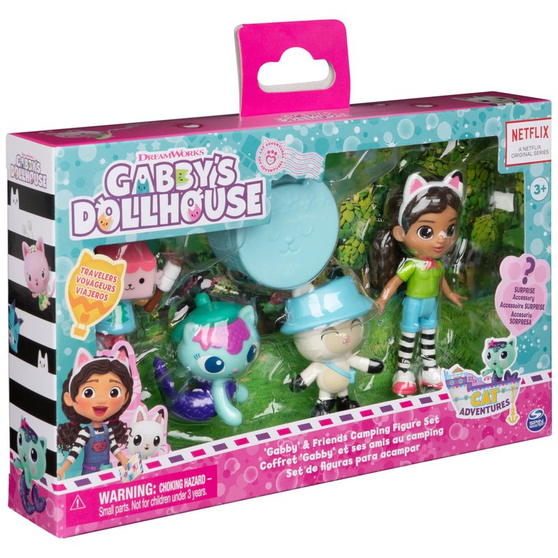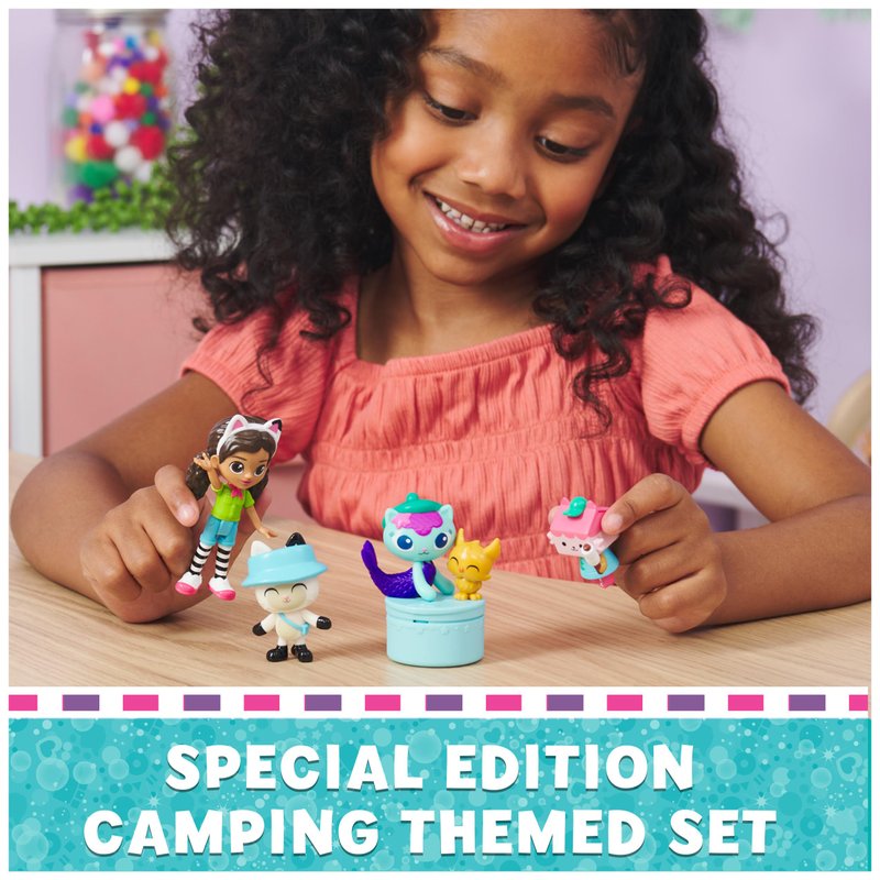 - 4 TOY FIGURES: Featuring an exclusive camping-themed Gabby doll, with her magic cat ears headband, and her adorable kitty-pals, Pandy Paws, MerCat and Baby Box Cat, in this Cat-Tastic figure set