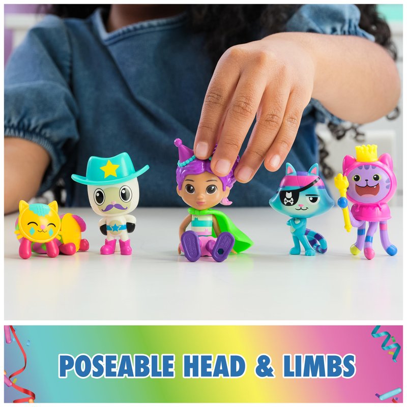 • 6 GABBY’S DOLLHOUSE TOY FIGURES: This special edition celebration-themed toy figure set features Gabby Girl, DJ Catnip, Catrat, Pandy Paws, Pillow Cat, and Kitty Fairy, for a Cat-errific Celebration