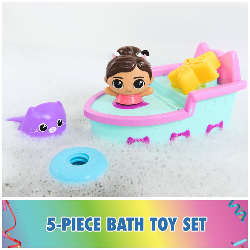 - GABBY’S DOLLHOUSE BATH TOYS: Create thrilling bath time adventures with a Gabby squirt toy, a Kitty Fish scooper, starfish strainer and a cruise ship toy that floats, for series-inspired pretend play