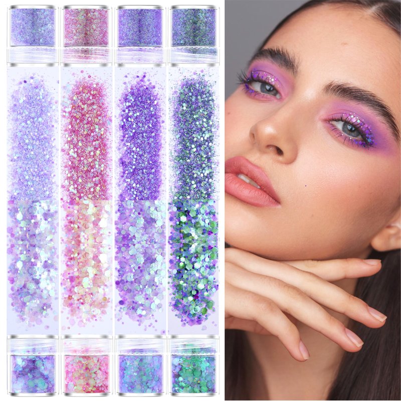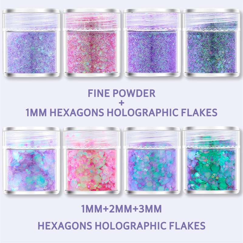- HOLO GLITTER PACK: 4 box holographic glitters sequins (fine glitters with 1mm flakes mix), good for nail arts, eyes, lip, face comestic, craft making. 4 box holographic glitters sequins (1mm/2mm/3mm flakes mix), good for hair, collarbones, shoulders, arms, face make up, craft making. Also you can mix them together to make more irresistible glow combinations