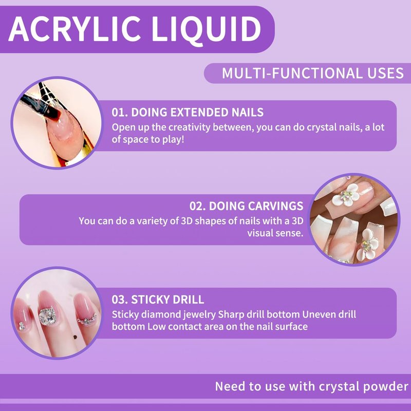 - 【High Quality Acrylic Monomer Liquid】:This Acrylic liquid use a special blend formula, it is chip-resistant and non-lifting, providing perfect consistency, excellent adhesion, no bubbles, self-leveling, with superior strength, durability and flexibility.