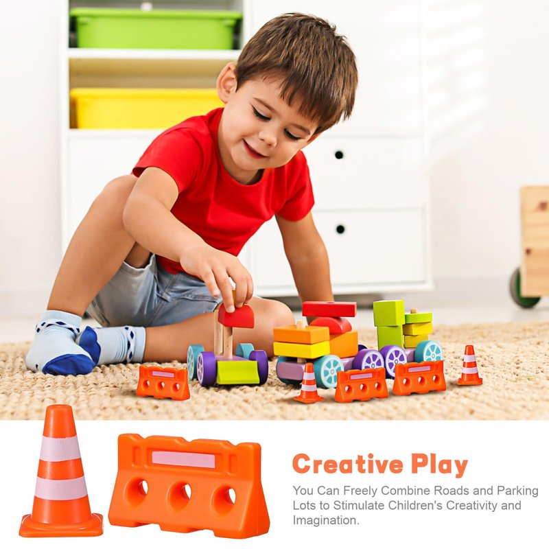 - Cognitive development: These cones and fences simulate real-life traffic scenarios, helping children develop their cognitive skills and understanding of the world around them