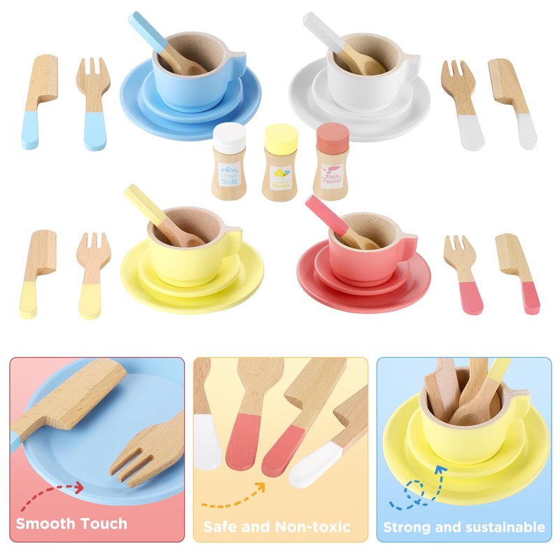 - 【27PCS Wooden Play Kitchen Accessories】The toddler kitchen playset includes 4*plates, 4*saucers, 4*cups, 4*spoons, 4*knives and forks, 2*condiment bottles,1*sugar jar. The toys are sized to fit children's small hands for all their dress-up dinner party needs.Upgraded stackable drop design, closer to life, convenient storage.