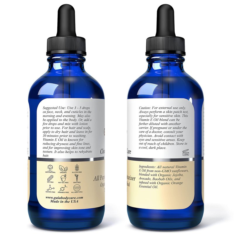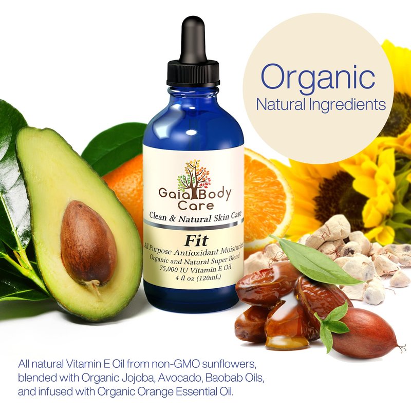 The Fit formulation was developed by Elan Liao, a retired organic chemist and owner of Gaia Body Care. She believes that great skin can be achieved with clean and natural ingredients. This Vitamin E Oil is an everyday oil for skin that is a super blend of organic and natural oils. This vegan skin care formulation includes pure vitamin e oil, blended with all organic avocado, baobab, jojoba, and orange essential oils. Our Vitamin E Oil component, D-alpha tocopherol, is derived from non-GMO sunflowers in Argentina that are rich in delta and gamma tocopherols. It is not derived from wheat germ or soy, so it is gluten free and soy free. The natural color of this incredible vitamin e moisturizer is amber hue, as there are no artificial colors, additives, fillers, or preservatives. It is also sulfate-free, paraben-free, and nut free. Our formulation is a minimum of 70,000 IU organic Vitamin E Oil to 75,000 IU and is made and tested in the USA. The consistency is a liquid vitamin e oil that is smooth upon application.