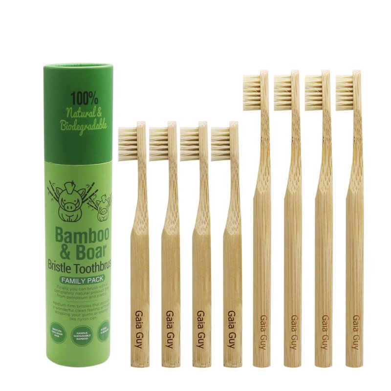 Gaia Guy Natural Bristle Bamboo Toothbrush Family Pack (NO Nylon - Boar Hair ONLY) - Totally Compostable & Biodegradable Boar Bristle and Bamboo Toothbrushes - Zero Waste - 4 Kids and 4 Adults