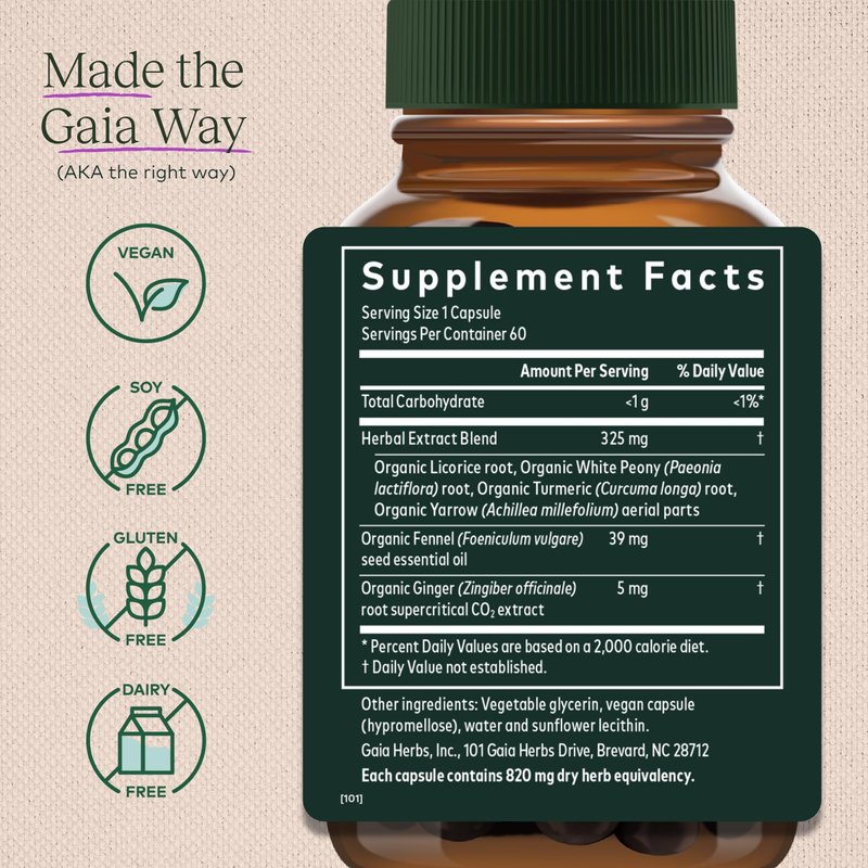 Experience the soothing touch of nature with Gaia Herbs' meticulously crafted remedy for menstrual discomfort. As a dedicated herbal supplement for women's health, our formula offers a comforting embrace during those times of the month when menstrual cramps strike.* By harnessing the power of white peony root, known for its role in hormone equilibrium, our product gently supports your body's quest for hormonal balance, contributing to a less stressful menstrual cycle.*