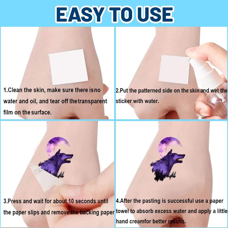 - Easy to apply and remove. Just place face down on skin and dampen with water. Hold it down for about 15 seconds, then remove and have done. These beautiful tattoos typically last about 3-5 days