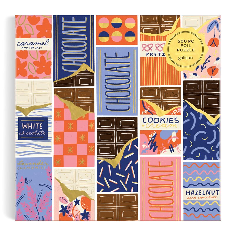 Galison at The Chocolate Bar – 500 Piece Foil Puzzle of Chocolate Bar Wrapper Artwork with Gold Foil Accents