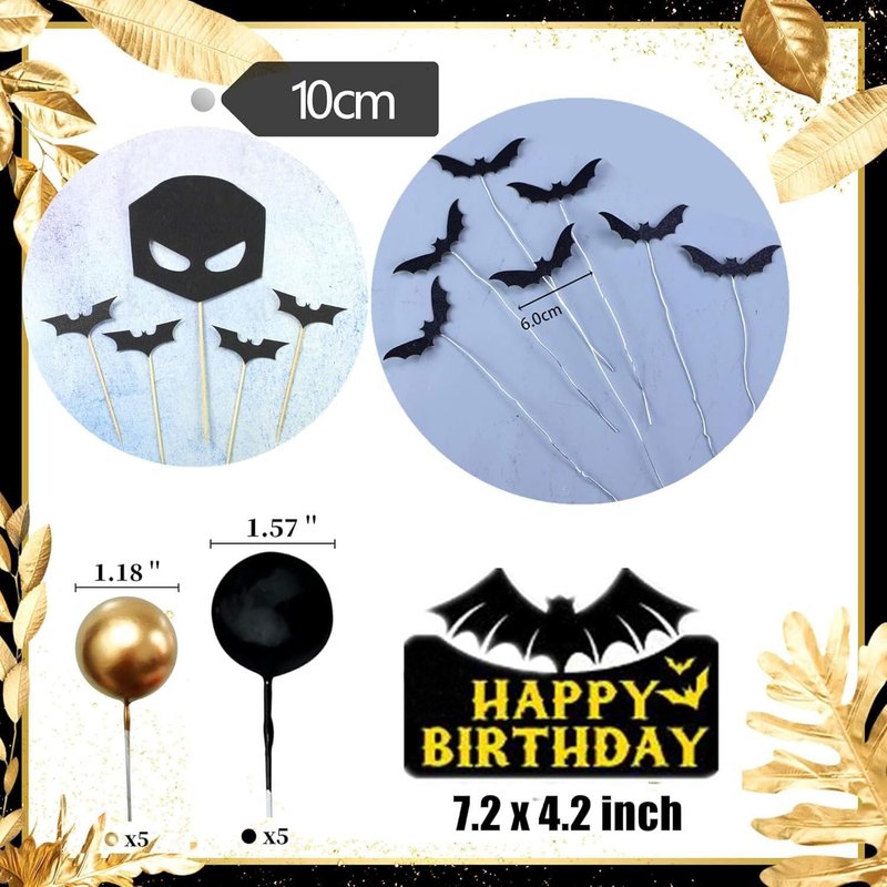 - BAT CAKE DECORATION: Our set includes 5 gold balls (1.2 inches), 5 black balls (1.6 inches), 10 cute Little Bat cake toppers, 1 Happy Birthday Bat hero cake topper, and 1 Bat hero cake topper.