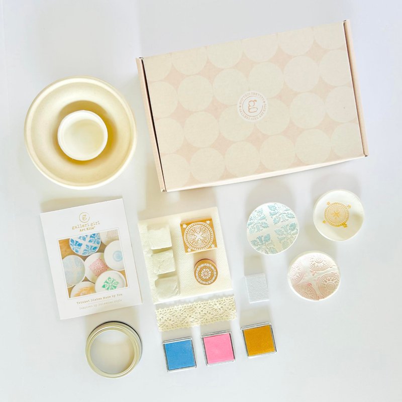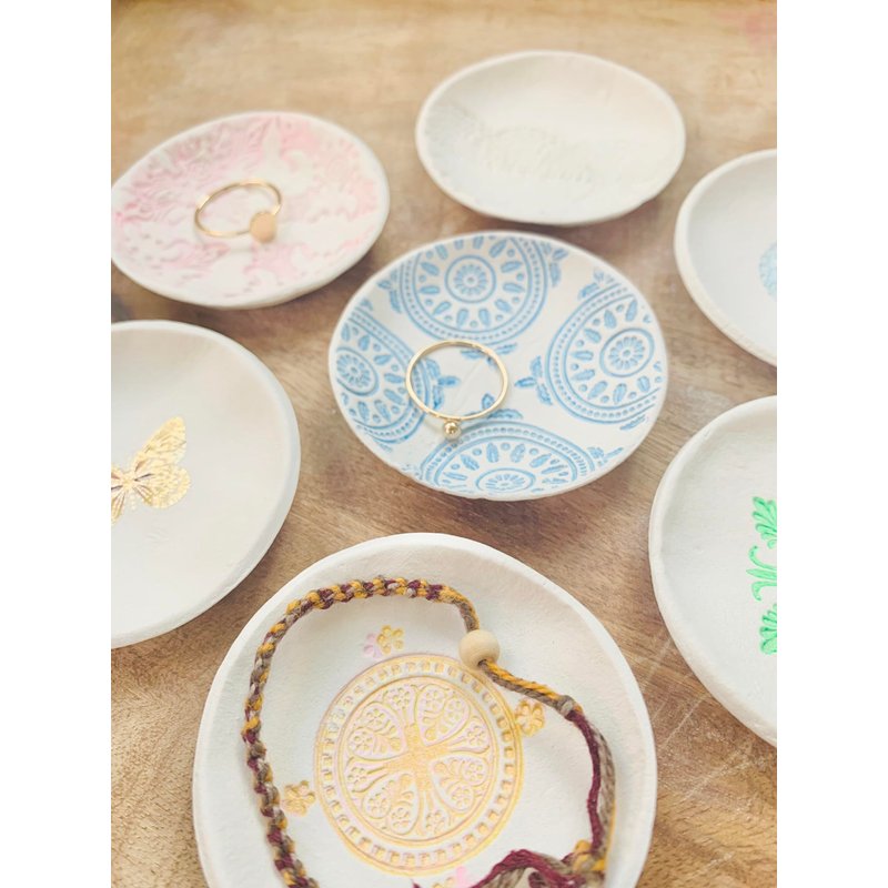 Our beautifully curated trinket dish kit includes everything you need to create 3 unique clay jewelry dishes. The clay is easy to work with and air dries to a hard, durable finish. You can use the included tools to roll, cut, and stamp the clay to create your own designs. The finished dishes are perfect for holding your special little things. Our kit also includes an easy-to-follow, on-line, video tutorial that takes you through the easy 5 step process. Whether you are a beginner or an experienced artist, this kit is a great way to create your own unique pieces of art and learn a little something along the way.