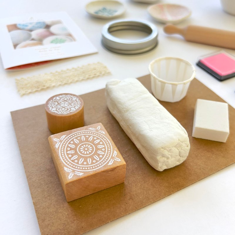 - INCLUDES: Easy to follow on-line video tutorial, non-toxic premium quality air dry clay, wood rolling pin, 2 rubber stamps, 3 colorful ink pads, transfer, and cotton lace to create your designs, a metal circle to cut your shape, bowls for drying, and a sanding block to smooth out the edges.