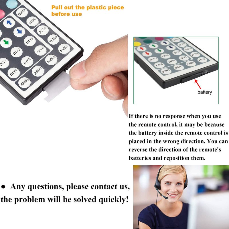【KINDLY REMINDER】 - ① Pull out the plastic cover on the buttom of remote before use. ② Connect box output port with led strip (arrows marks between control box and strip connector should be on same position). ③ Remote should be aimed at the ir receiver and without any obstacles.④ Indoor use only, keep away from water.