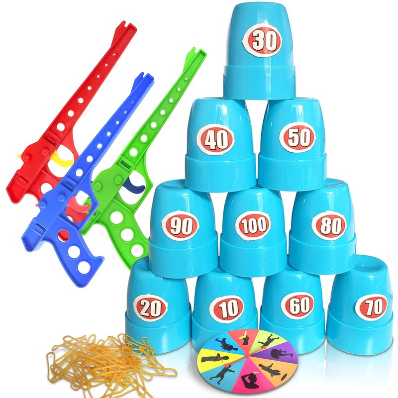 set comes with 3 rubber launcher toy guns, 100 rubber bands, a game turntable, 10 cups, and score stickers. Get the whole family