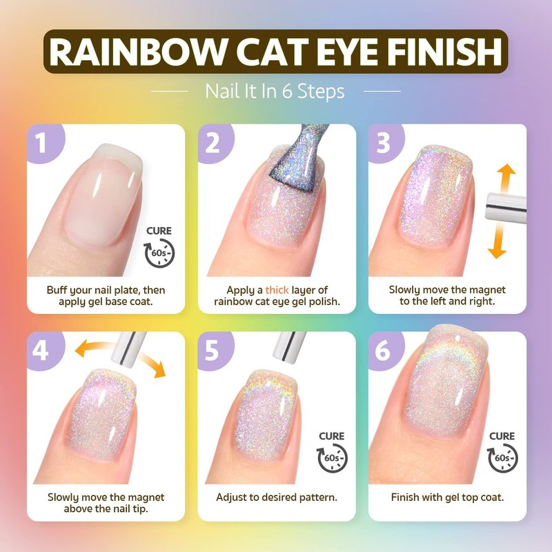 - RAINBOW GLITTER CAT EYE: Use the magnet to create desired pattern before curing. Apply gel top coat for gorgeous shimmery and sparkly finish. Heat up in winter to reduce thickness. Cure with UV light for 60s to dry.