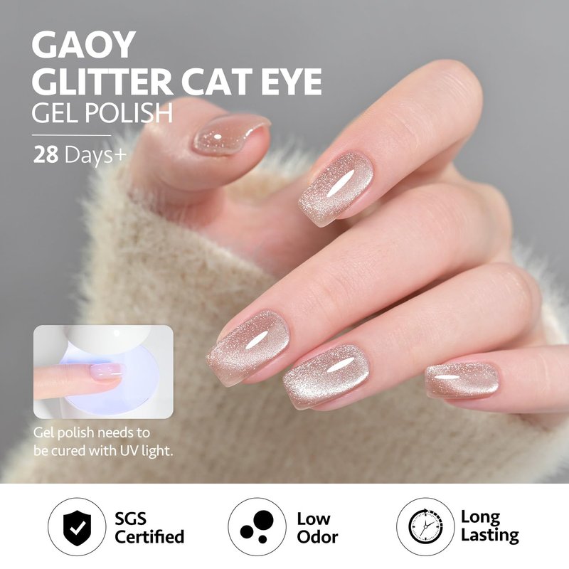 - Glitter Cat Eye: Use the magnet to create desired pattern before curing. Apply gel top coat for gorgeous shimmery and sparkly finish. Heat up in winter to reduce thickness.