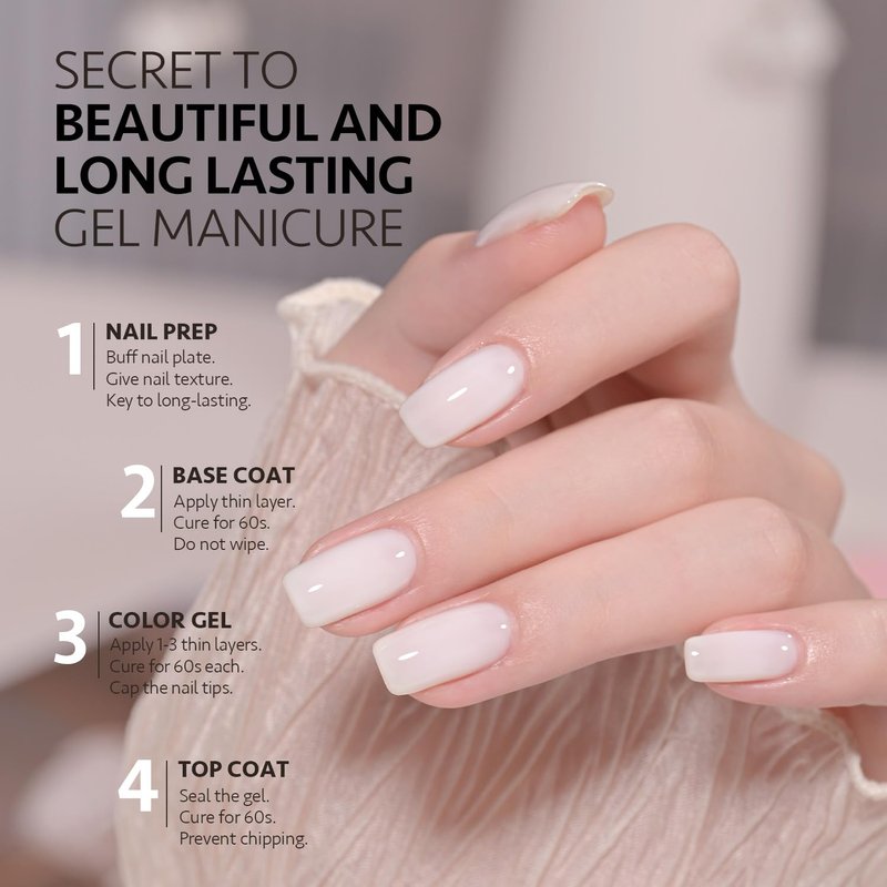 - 4 weeks long-lasting: Buff your nail bed before base coat to give your nail texture. Apply top coat after color gel for shiny finish.
