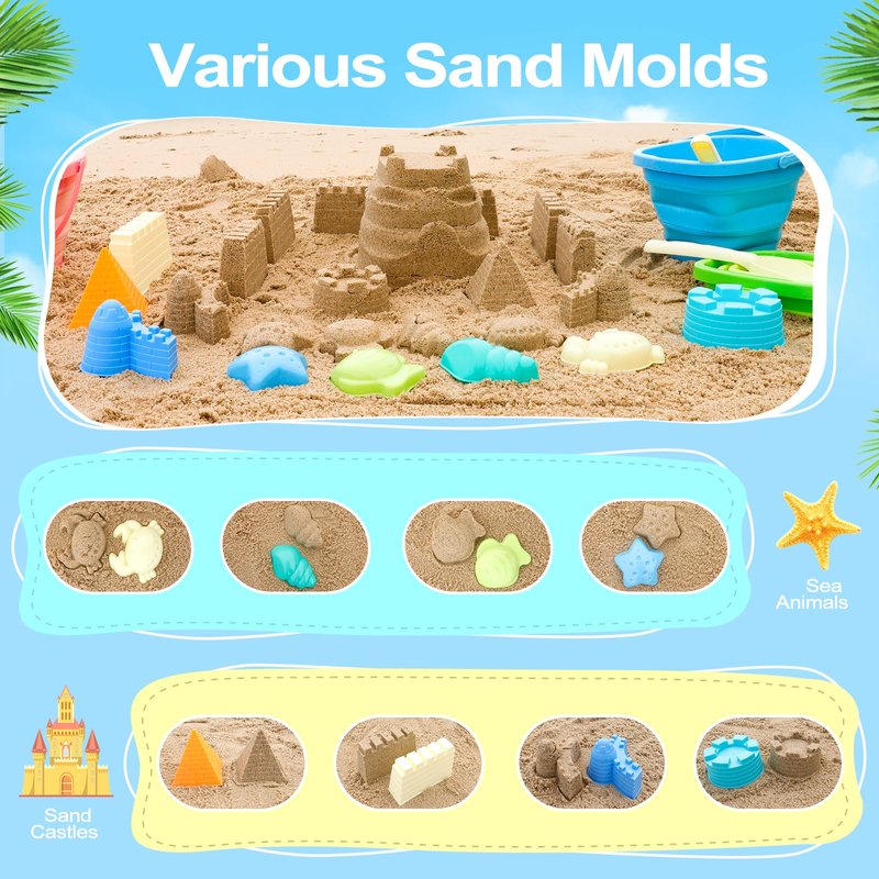 - Super value kids sand toys for beach travel and sand box, including foldable beach bucket *3, sand shovel *3, sand castle mold *4, sea animal mold *4.