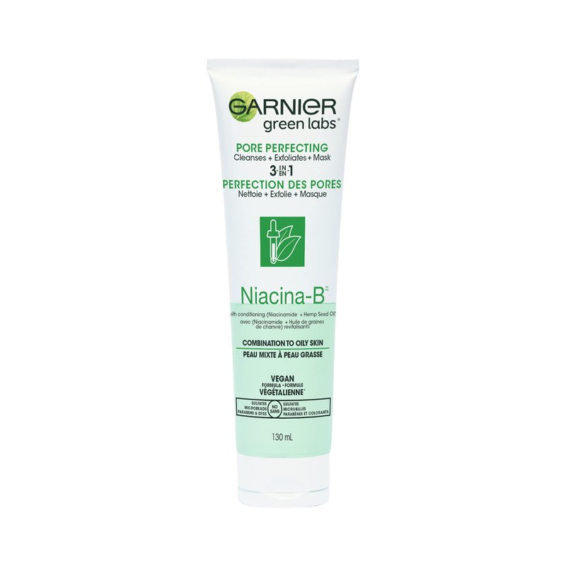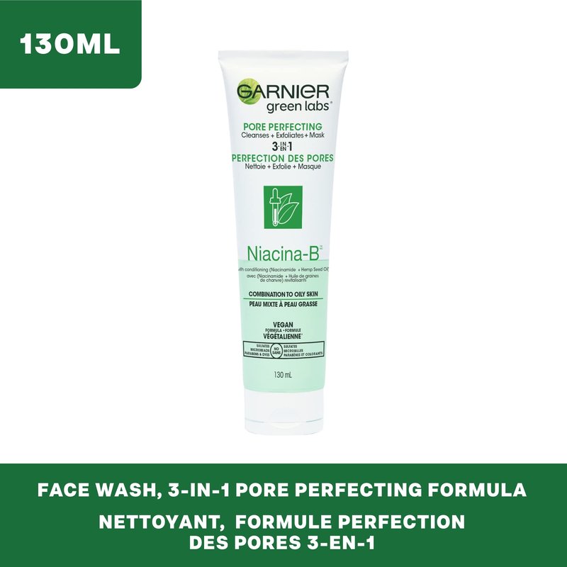 - Garnier Green Labs Pore Perfecting 3-in-1 Face Wash + Exfoliator + Face Mask is a scrub-free face wash, gentle exfoliator, and face mask
