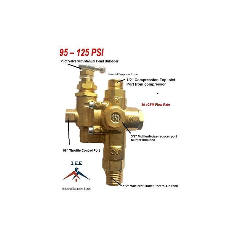 - 30 CFM Flow Rate, Pressure differential 10 to 50 psi, operating temp -65f to 400f max. All brass construction and built for the rigors of outdoor gas compressors. Manual hand unloader toggle and brass venting muffler included.