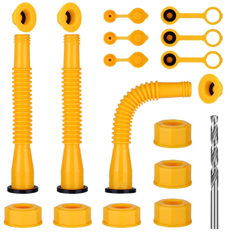 - Value Set:19Pcs Gas Tank Nozzle Replacement Sets Include: 3 Yellow Spouts, 6 Screw Collar Caps ( 3 Coarse Thread And 3 Fine Thread ), 3 Spout Sealing Caps, 3 Gas Can Vent Caps-A ( Used for Oil Cans Without A Vent At The End ), 1 Universal Drill Bit ( Use A Drill To Drill A Hole At The End ), 3 Gas Can Vent Caps-B ( Used For Barrels With A Vent Cap At The Top ).