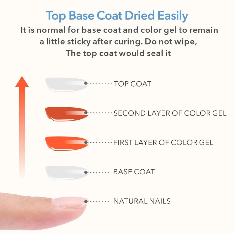 - Dried easily: Cure about 60 seconds to dry. It is normal for base coat and color gel to remain a little sticky after curing. It gives better adhesion between nails and gel layers. Don't worry. The top coat would seal it. (Please do not over-cured it or it would peel off easily)