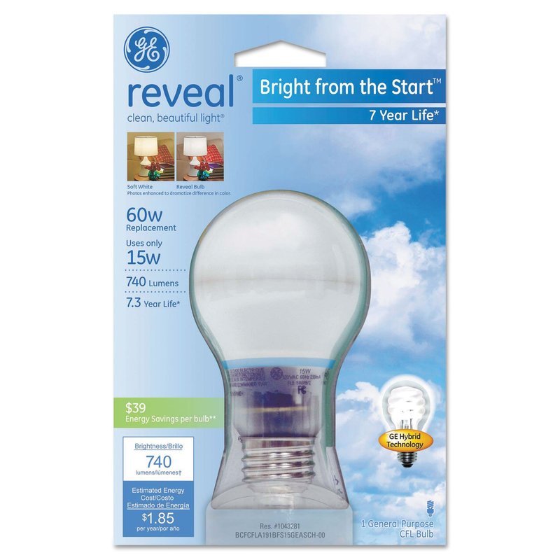 Ge Lighting 63508 Reveal® Bright From The Start™ A19 Cfl Bulb, 15w
