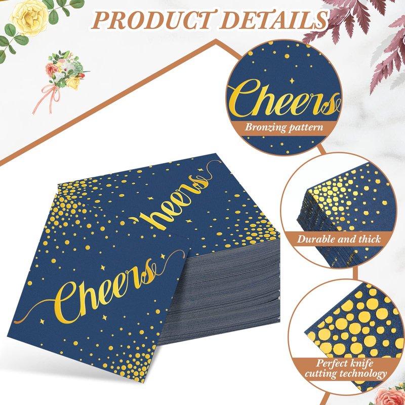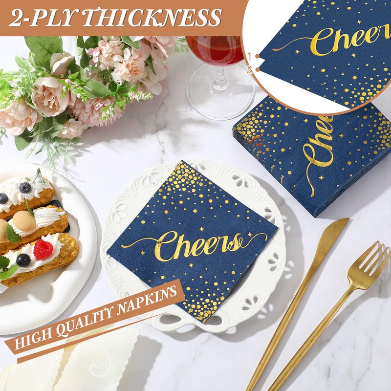 Geelin 180 Pieces Cheers Napkins Gold Napkins Cocktail Napkins for Wedding Reception Beverage Paper Napkins Disposable Bar Napkins for Engagement Party Graduation Baby Shower, 5 x 5 Inch (Navy Blue)