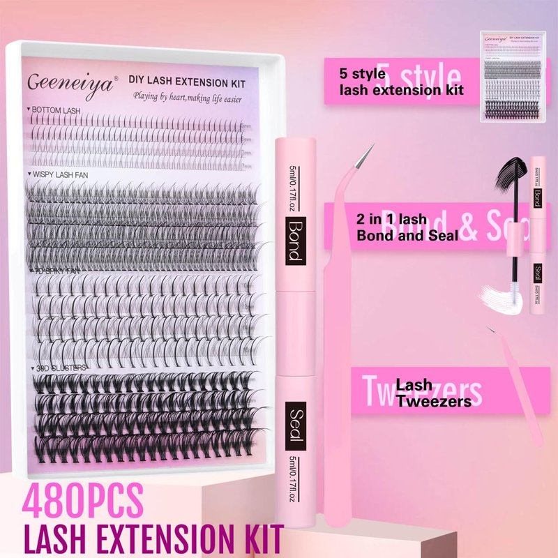 - NEW ARRIVAL: Geeneiya mix-style wispy lashes extension kit provides 480pcs d curl lash clusters*5 styles, upgraded lash bond and seal lash glue*1, ergonomically designed alloy lash tweezers*1. Geeneiya NEW diy eyelash extension kit can give you a wonderful diy eyelash extensions