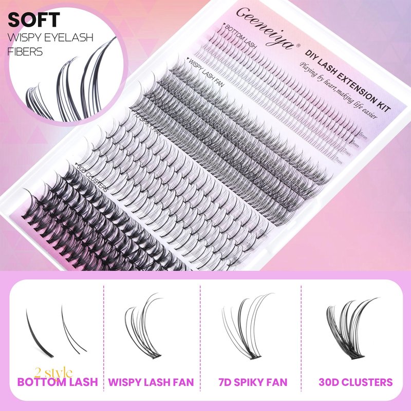 - Lash Clusters Kit with Bottom Lashe: Lash extension kit contain 5 styles individual eyelashes clusters: WISPY LASH FAN/7D SPIKY FAN/30D CLUSTERS and 2 styles 5-7mm individual BOTTOM LASHES. Geeneiya cluster eyelash extensions adopted the 0.05D synthetic material, more soft and lightweight than normal natural eyelashes. Bring you "0" burden and comfortable DIY lash extensions