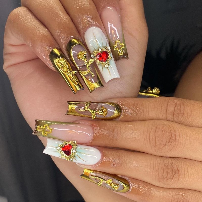 Gehaiwo 96PCS Gold Nail Charms for Acrylic Nails,Alloy Red Heart Cross Rose Flower Angel Frame Nail Decoration,Nail Art Rhinestone Nail Gems Nail Jewels Accessories for Nail Art Supplies DIY Nail