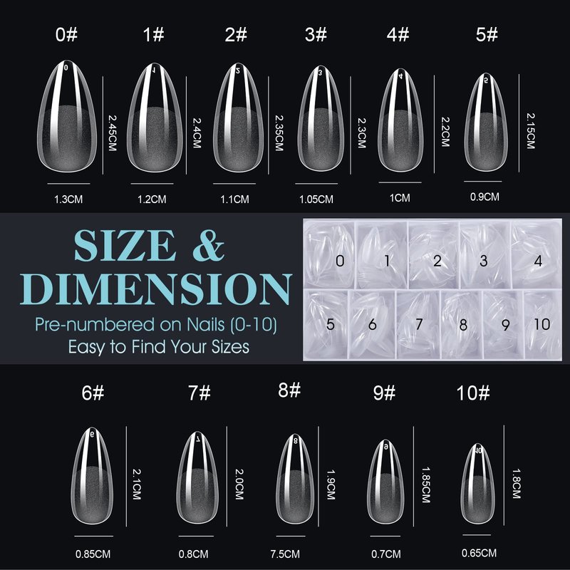 - [VARIETY OF SIZES] 552pcs Medium almond nails offers 12 different sizes with 46 nails of each size.Each nail tip has a small number of the corresponding size on it.