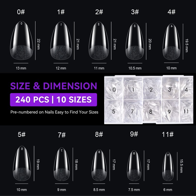 - [ASSORTED SIZES] These short almond nails comes in 10 different sizes with 24 nails of each size, which makes it a total of 240 pieces. It has corresponding size of each nail tip, and it's perfect for nail lovers to DIY!!!