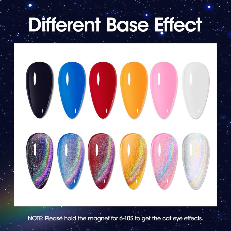 - 【Easy application, Cure with UV Lights】: Firstly, apply base gel and cure it, secondly, apply this cat eye gel without curing,and create your desired effect with the magnetic stick and cure it for 60s, finally apply the top coat. This glitter magnetic cat eye gel nail polish is suitable for both professionals and starters.We suggest you do more try and practice to get your optimal manicure effect.