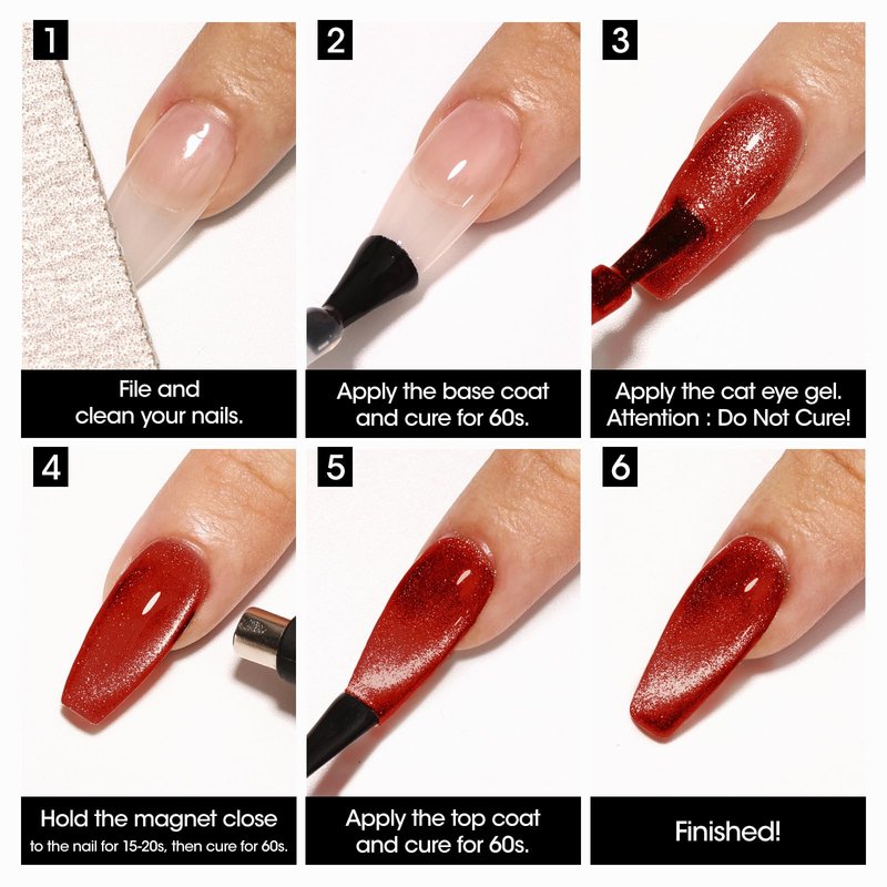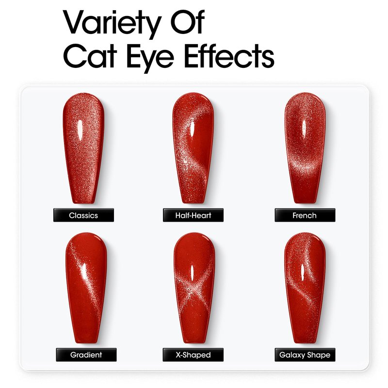 - Classic Red Cat Eye Gel: The Gel Polish Kit has six captivating red shades, from magnetic burgundy to glittering light red, unveiling the mesmerizing cat-eye effect on your nails. Elevate your DIY nail art game with effortless elegance, giving your nail a timeless and sophisticated look.