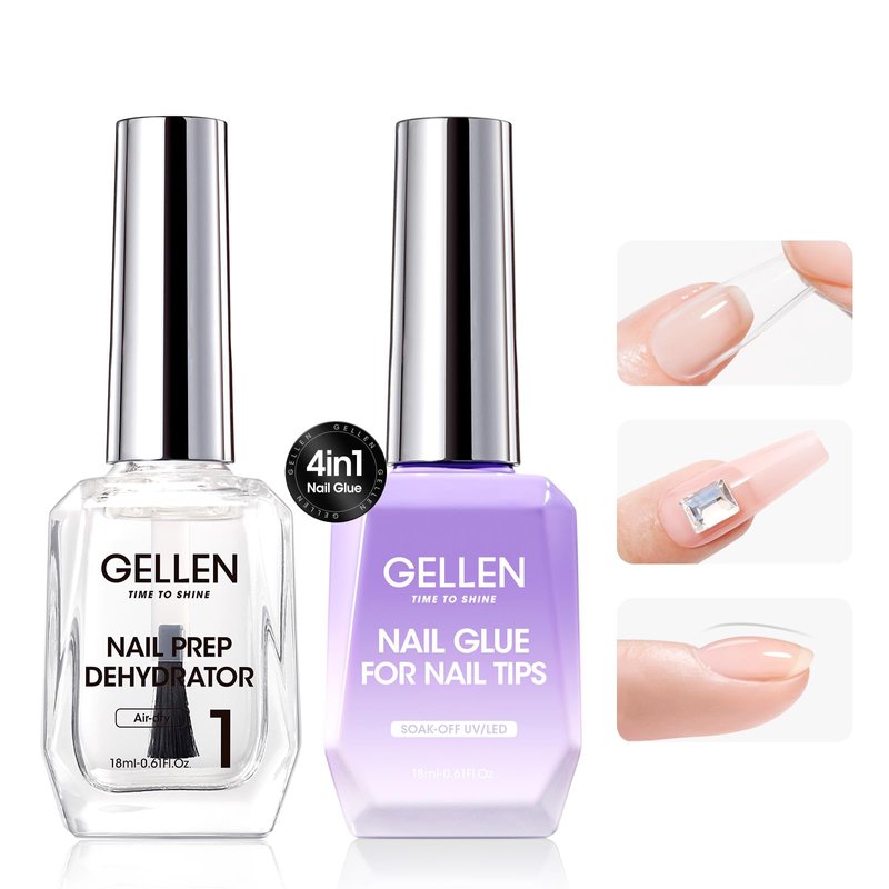 - 4 in 1 Nail Glue and Nail Pre Dehydrator: Gellen 18ml/0.61 Fl Oz gel nail glue and nail dehydrate set can create a strong foundation by reducing grease to provide super strong stickiness for your false nail tips, acrylic nails and clear press on nails (not solid press-on nails). In addition, the glue gel also can be as gel base coat, nail strengthener and nail rhinestone glue gel. Save your money and time to enjoy your DIY manicure