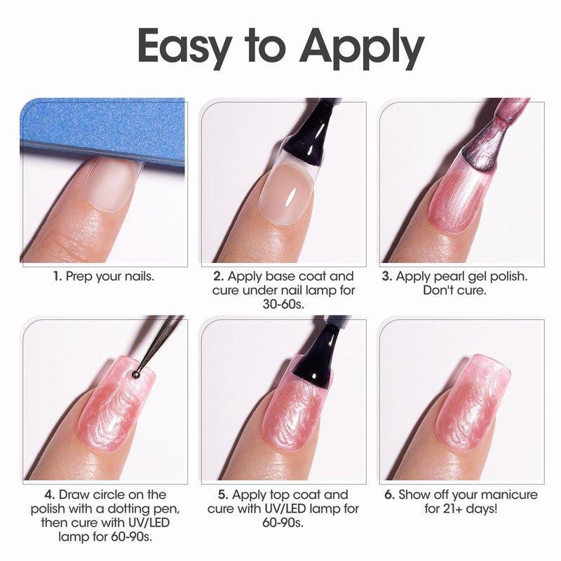 - 【Pearl Gel Nail Polish】: Pearl Effect Nail Polish features a beautiful micro-shimmer effect that glistens in the sunlight. 2-in-1 shimmer gel polish, 10ML/ 0.33fl oz, not only can be pearl gel polish but also can be thread Shell nail gel. A selection of 6 popular colors, nude skin tones to elegant pastel shades for all year round