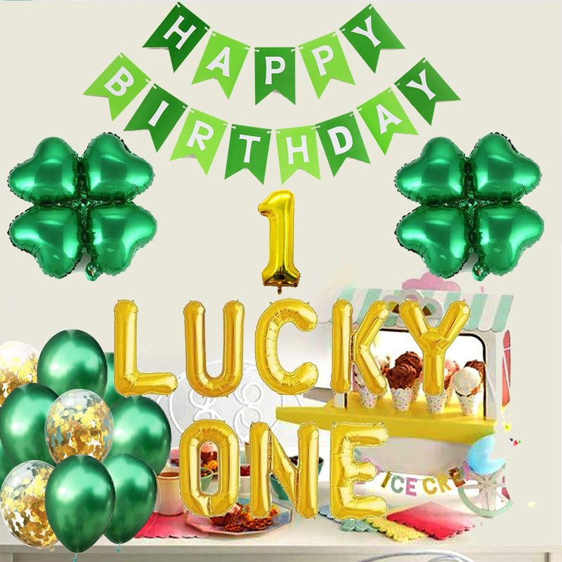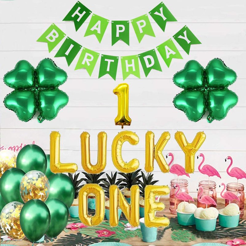 - INCLUDE: 16 inch LUCKY ONE 1 Balloons Banner, 2 Four Leaf Clover Shamrock Foil Balloons, 1 St. Patrick's Day HAPPY BIRTHDAY banner, 10PCS St. Patrick's Day latex balloons, 1 String, 1 Straw, 24 PCSSt. Patrick's Day 1st Birthday Party Decorations in total.