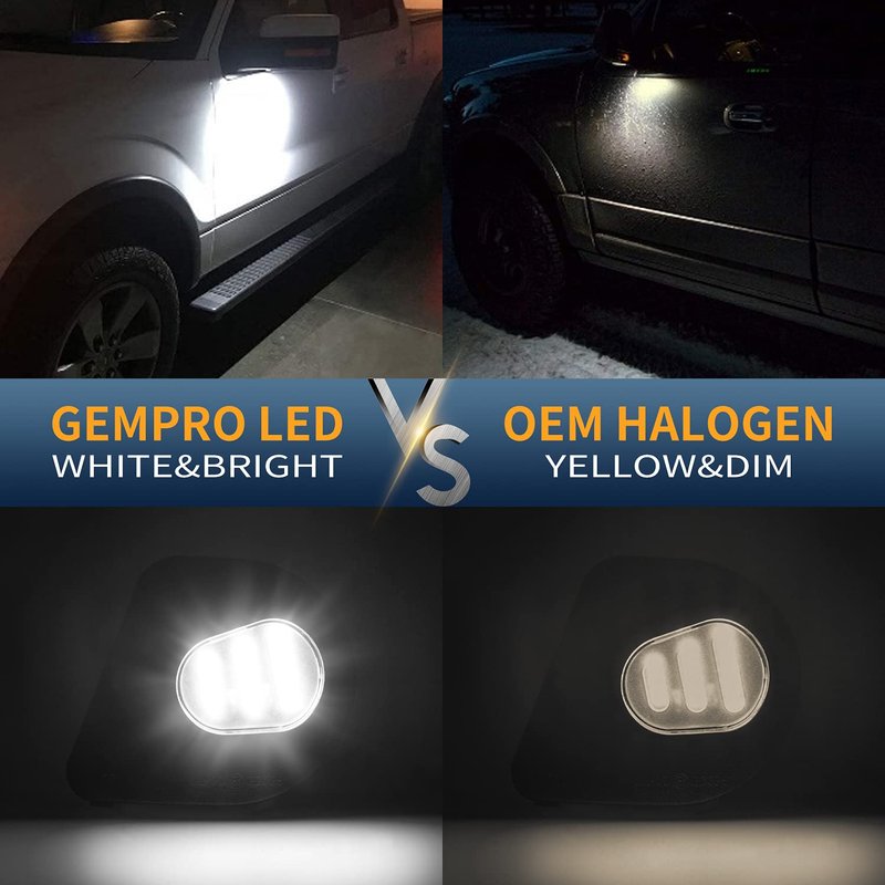 - [ HIGH BRIGHTNESS ] - This GemPro puddle light built-in high power SMD LEDs, 5x brighter than OEM light bulbs. 6000K super bright output to maximize illumination around your vehicle.