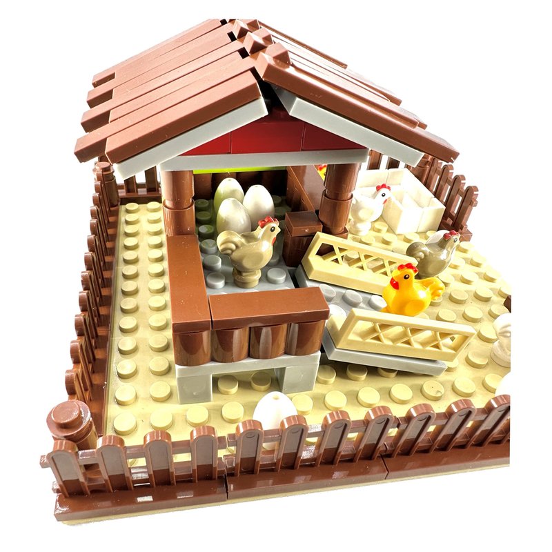 - It contains 6 hens, 6 eggs, 13 pieces of fencing, and a baseplate as well as pieces to build your own coop and feeding trough. This coop is fun and creative to build and can be added to other rural sets like our barnyard set or our country garden set. If you have a city streets group branch out into a rural country scene or have city chicken in your back yard. The finished build measurements are 4.8 in x 4.8 in x 2.56 in.