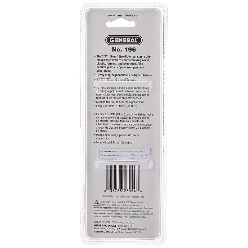 General Tools 196 Short Length Hand Reamer & Countersink, 3/4"