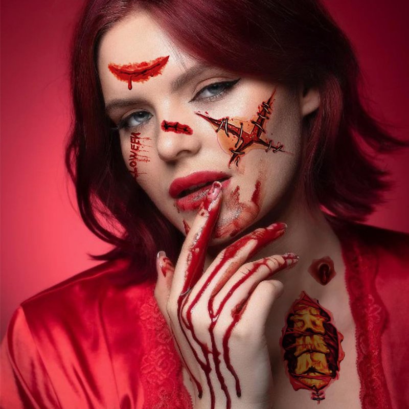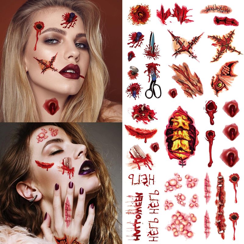 - Design: Halloween tattoo stickers use scary fake blood, fake scars, fake cuts, fake injuries tattoo design, look real and natural, showing a shocking and lifelike effect, to create a scary atmosphere of the festival