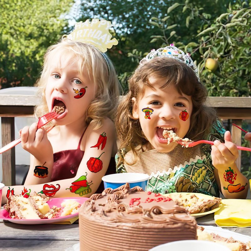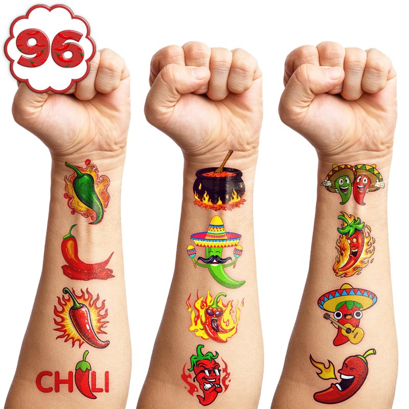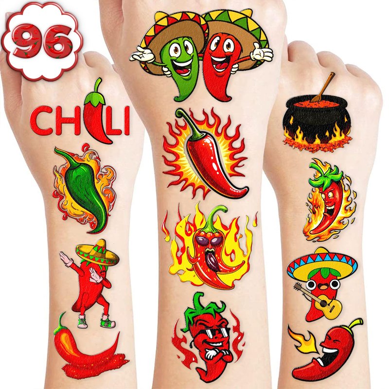 - 🔥CHILI PARTY FAVORS: Add some spice to your party with these Chili temporary tattoos! Choose from a variety of incredible designs, with many CHILI images, such as images of hot peppers, Chili cook up, Cinco de Mayo,... Get yours now to make your event even more exciting!